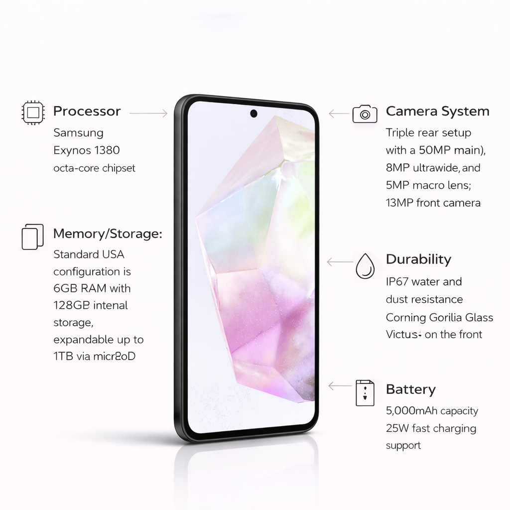 - Premium & Durable Design: Featuring an elegant glass back and a linear camera layout, the A35 5G offers a sleek, modern look. Built to last, it is protected by Corning® Gorilla® Glass Victus®+ and carries an IP67 water and dust resistance rating.