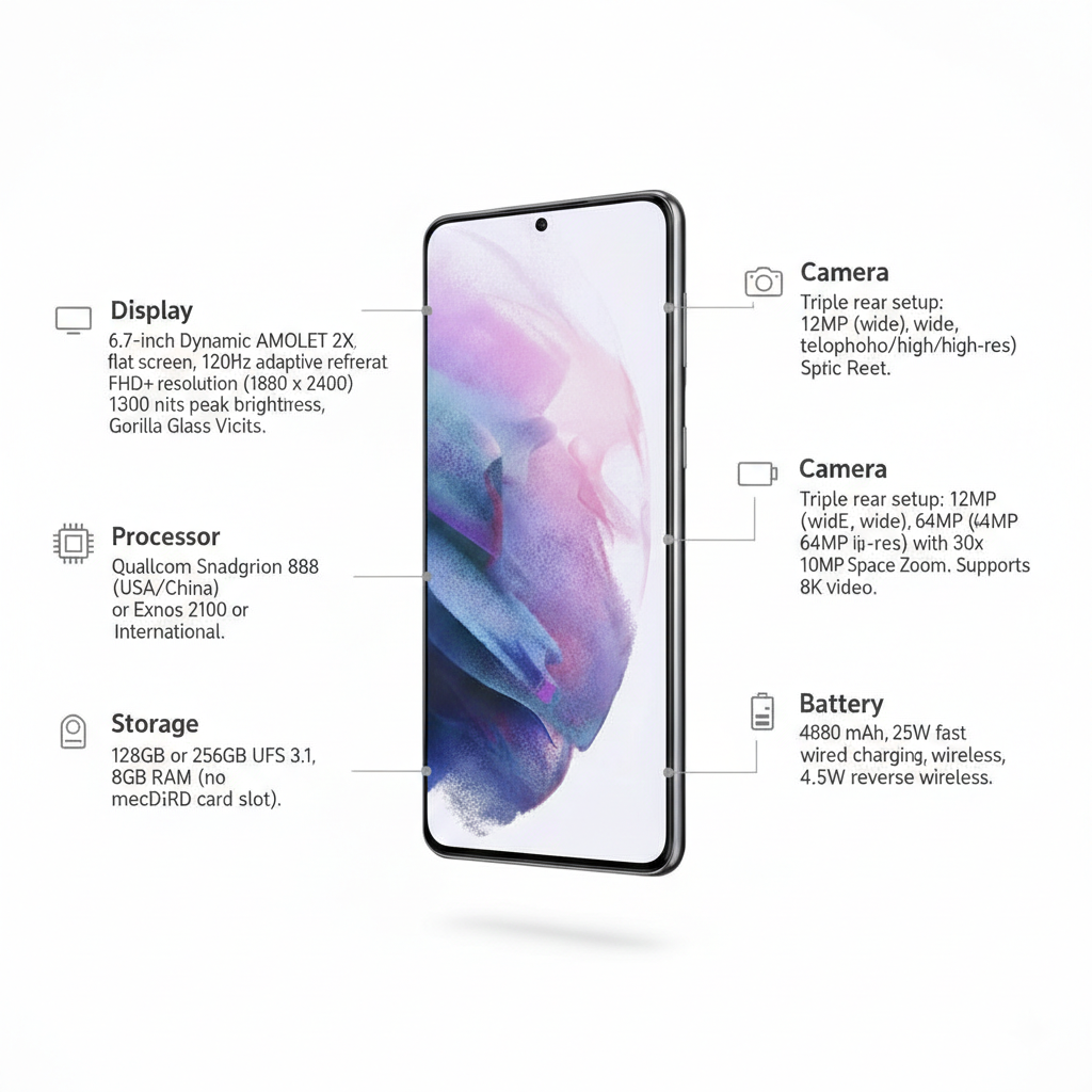 The Samsung Galaxy S21+ 5G (Unlocked) takes the power of the S21 series and scales it up for those who need more. Featuring an expanded 6.7-inch display and a high-capacity 4800mAh battery, it is the perfect device for binge-watchers, marathon gamers, and power users. With its premium glass-and-metal design and the same professional-grade 8K camera system as the standard S21, it is a sophisticated powerhouse that bridges the gap between everyday utility and pro-level performance.